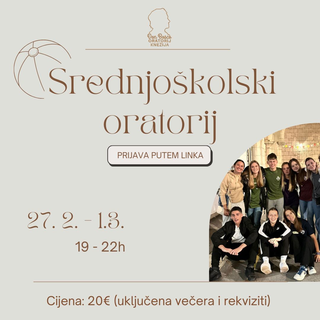 S radošću vam najavljujemo ovogodišnji zimski oratorij za srednjoškolce koji će se održati od 27. veljače do 1. ožujka od 19 do 22 sata.